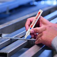 Pennarello a vernice - Edding 750 per una scrittura molto coprente e permanente anche su materiali scuri e trasparenti. Marcatura su metallo, vetro, plastica ecc.. e in particolare su tutte le superfici lisce. Asciugatura rapida della vernice e lieve odore. Resistente all'acqua, alla luce, al calore fino a 400°C (1000°C per alcuni colori come bianco, giallo, argento) e resistente all'abrasione. Erogazione dell'inchiostro controllata da valvola. Senza toluene/xilene.