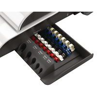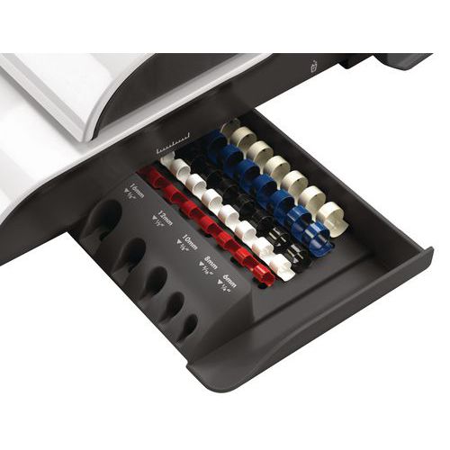 Rilegatura facile grazie ai denti di supporto dell'anello inclinati. Blocco di allineamento regolabile per allineare con precisione tutti i documenti. Rilegatrice munita di cassetto con caricatore di dorsi di rilegatura e di documenti. Apertura automatica del cassetto con gli scarti per evitare gli inceppamenti. Capacità di rilegatura massima di 300 pagine, con dimensione massima dei dorsi di 38 mm. Per perforazione e rilegatura