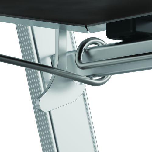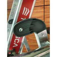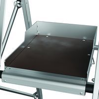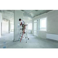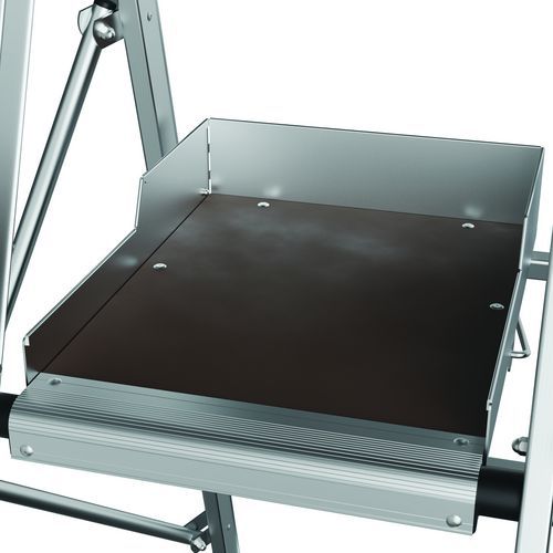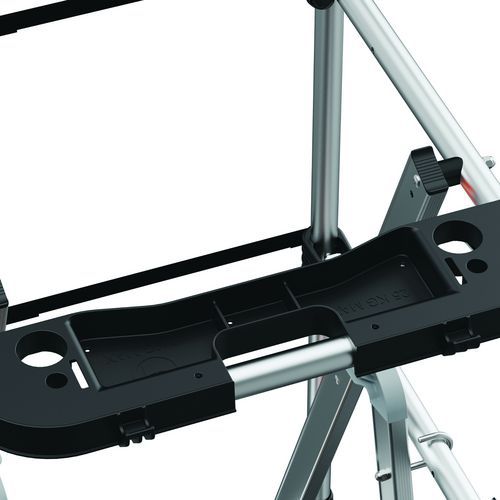 Piattaforma di lavoro Raptor con cinghia, la gamma più leggera sul mercato. Parapetto rigido su 3 lati con cinghie di protezione anticaduta posteriori. Gradini antiscivolo 80 mm. Porta-attrezzi con scomparto rimovibile, portata 25 kg, con ganci integrati (max 10 kg). Pianale 500 x 400 mm antiscivolo in legno biologico. Spazio di lavoro ergonomico. Stabilizzatori retrattili a regolazione millimetrica.