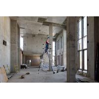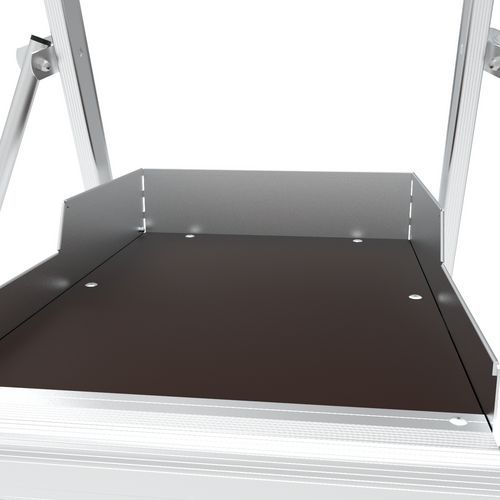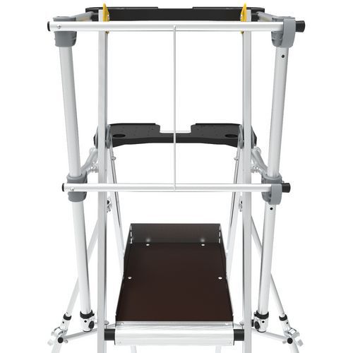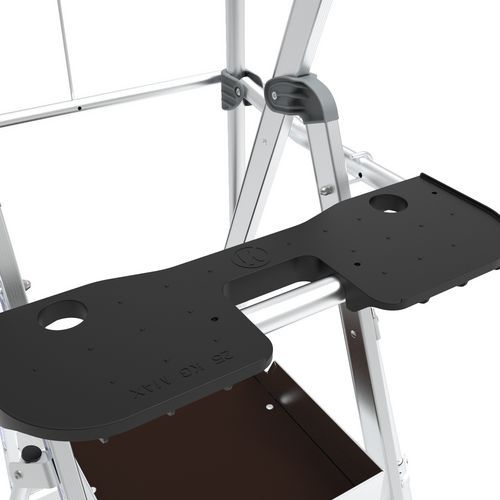 Piattaforma di lavoro Sherpamatic. Parapetto rigido su 4 lati con correnti di protezione anticaduta posteriore con chiusura semi-automatica. Gradini antiscivolo 80 mm. Porta-attrezzi con scomparto rimovibile, portata 25 kg, con ganci integrati (max 10 kg). Ripiano XL con portata 25 kg e stabilizzatori retrattili a regolazione millimetrica. Pianale a elevato comfort 590 x 400 mm antiscivolo in alluminio. Spazio di lavoro comodo ed ergonomico. Rotelle di movimentazione adatte a tutte le superfici Ø175 mm.