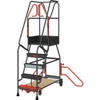 Scaletta per scaffalatura su ruote a immobilizzazione automatica per una maggiore sicurezza e un’ergonomia ottimale. In acciaio saldato meccanicamente con gradini autoportanti antiscivolo e pianale superiore in lamiera bugnata antiscivolo. Sportello su pianale superiore: apertura in un solo senso per garantire la massima sicurezza dell'operatore. Ampio ripiano su piattaforma inferiore in legno multistrato, verniciato, resistente, utilizzabile come spazio di stoccaggio. Ottima stabilità: stabilizzatori orientabili e mancorrenti saldati meccanicamente su ciascun lato.