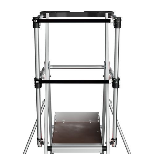 Piattaforma mobile Veloce. Parapetto rigido su 3 lati con cinghie di protezione anticaduta posteriori. Rotelle a scomparsa per una mobilità rapida e ottimale. Gradini antiscivolo da 80 mm. Porta-attrezzi con scomparto rimovibile, portata 25 kg, con ganci integrati (max 10 kg). Pianale 500 x 400 mm antiscivolo in legno biologico. Spazio di lavoro ergonomico. Stabilizzatori retrattili a regolazione millimetrica.
