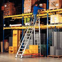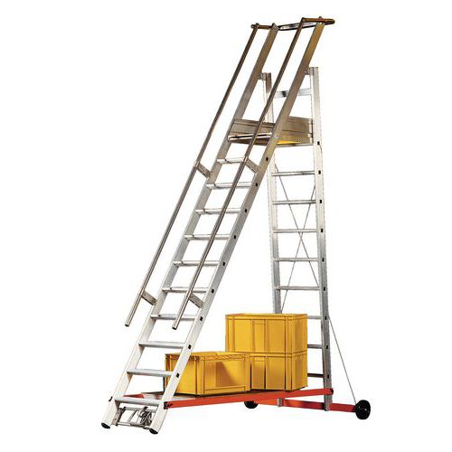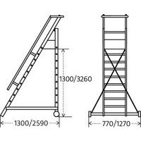 Piattaforma mobile con gradini antiscivolo. Comoda con gradini larghi e striati. Scala con 2 stabilizzatori retrattili. Zoccoli alti 150 mm su 3 lati. Piattaforma con rotella a scomparsa anteriore.
