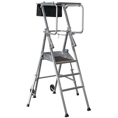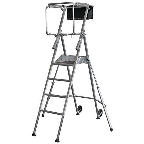 PIRL super pieghevole ad altezza regolabile. Apertura rapida e intuitiva. 2 stabilizzatori facili da estendere. Borsa portautensili molto resistente. Trasportabili in piccoli furgoni.