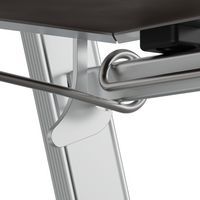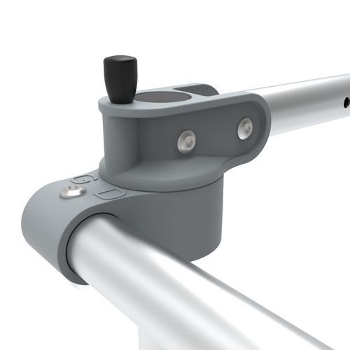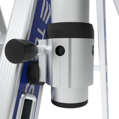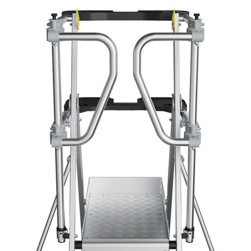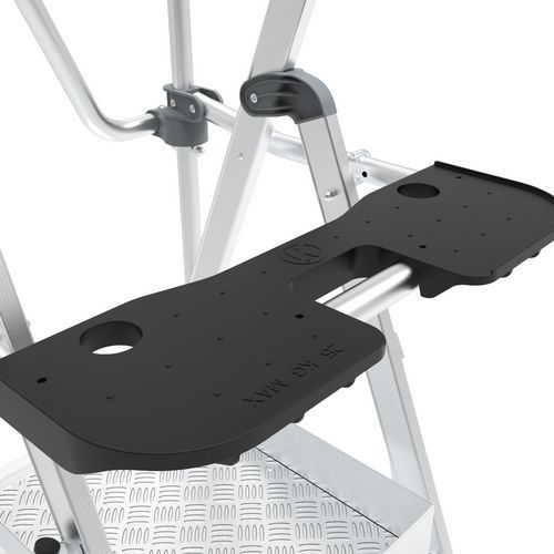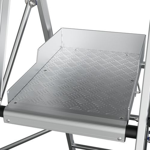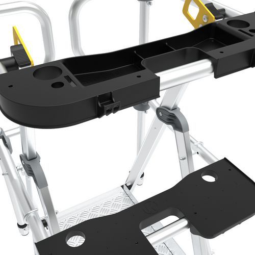 Piattaforma Sherpamatic Saloon. Parapetto rigido su 4 lati con cancello tipo Saloon a chiusura automatica. Gradini antiscivolo 80 mm (piano fisso) e 60 mm (piano telescopico). Porta-attrezzi a scomparti rimovibile con portata di 25 kg e ganci integrati (max 10 kg). Pianale XL con portata di 25 kg. Pianale a elevato comfort 590 x 400 mm antiscivolo in alluminio. Spazio di lavoro comodo ed ergonomico. Stabilizzatori retrattili a regolazione millimetrica. Sistema di regolazione dell'altezza intuitivo e sicuro, a incrementi di 23 cm. I piani telescopici consentono la regolazione del livello.