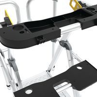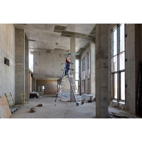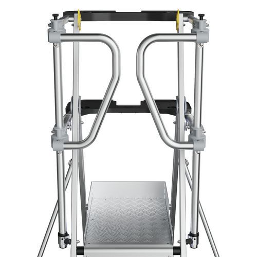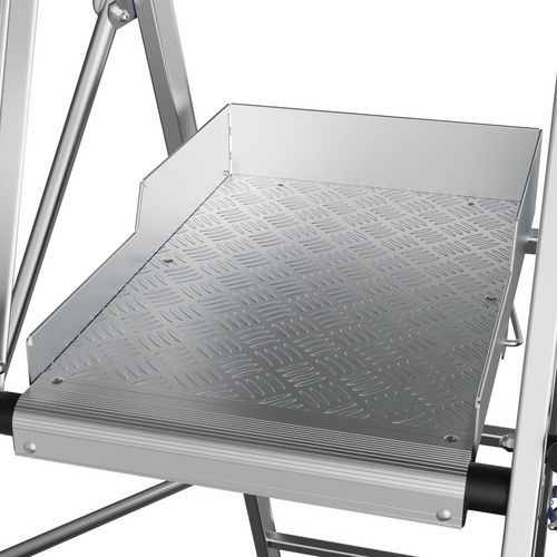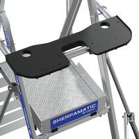 Piattaforma di lavoro Sherpamatic, robusta e comoda con parapetto Saloon. Parapetto rigido su 4 lati con cancello tipo Saloon a chiusura automatica. Gradini antiscivolo 80 mm. Porta-attrezzi con scomparto rimovibile, portata 25 kg, con ganci integrati (max 10 kg). Pianale XL con portata di 25 kg. Stabilizzatori retrattili a regolazione millimetrica. Pianale a elevato comfort 600 x 400 mm antiscivolo in alluminio. Spazio di lavoro comodo ed ergonomico.