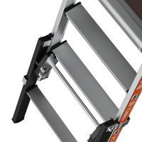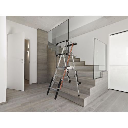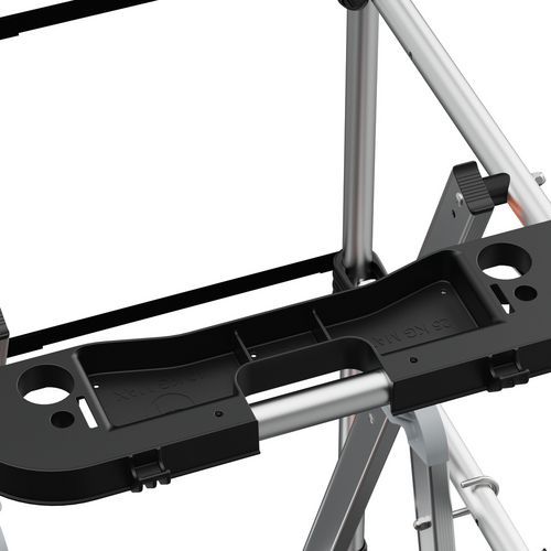 Piattaforma regolabile Raptorcopic. Parapetto rigido su 3 lati con cinghie di protezione anticaduta posteriori. Gradini antiscivolo 80 mm (piano fisso) e 60 mm (piano telescopico). Porta-attrezzi a scomparti rimovibile con portata di 25 kg e ganci integrati (max 10 kg). I piani telescopici consentono la regolazione del livello. Sistema di regolazione dell'altezza intuitivo e sicuro, a incrementi di 23 cm. Pianale 500 x 400 mm antiscivolo in legno biologico. Spazio di lavoro ergonomico. Stabilizzatori retrattili a regolazione millimetrica.