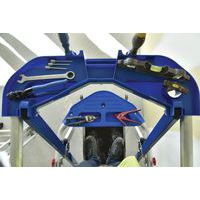 Ripiano superiore molto capiente. Forma incurvata per lavorare più in prossimità di una parete. 2 ganci porta-secchio. Maniglia di movimentazione integrata. Ripiano inferiore adatto a fusti da 15 L.