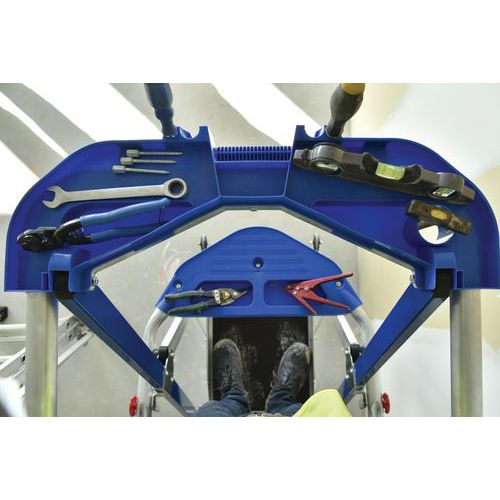 Con 2 ripiani a scomparti: 1 ripiano alto a portata elevata dalla forma curva per lavorare in prossimità dei muri, dotato di 2 ganci portasecchio e una maniglia di trasporto integrata, 1 ripiano basso per un fusto da 15 L.