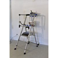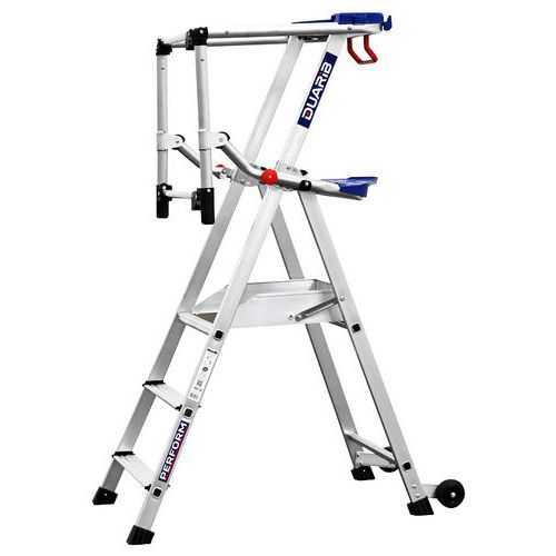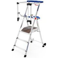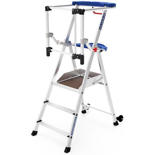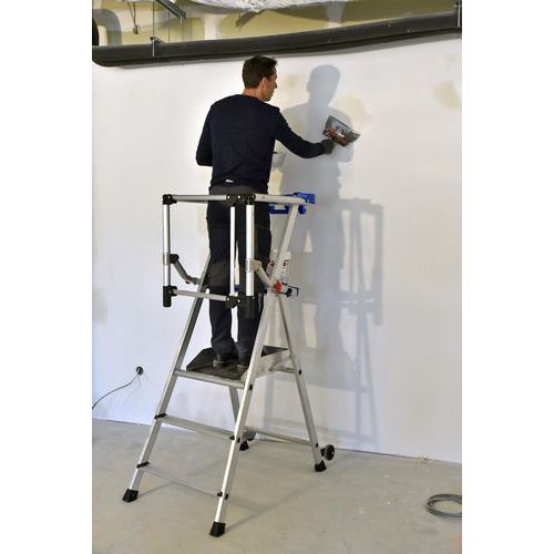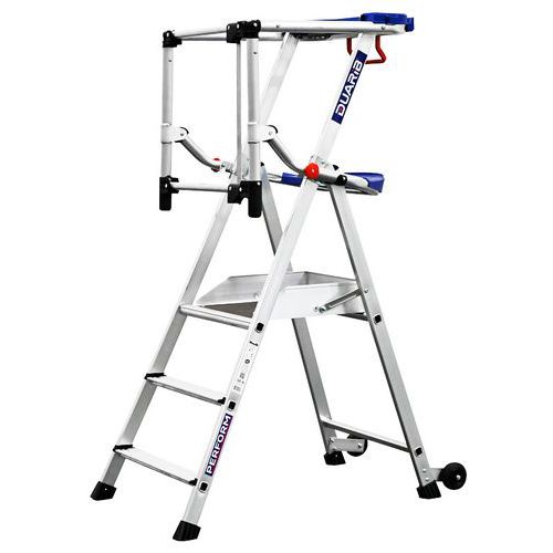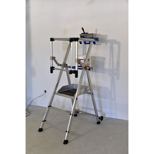 Piattaforma singola fissa autoportante nuova generazione in alluminio. Installazione rapida e facile con messa in sede dei parapetti con 1 solo gesto. Sicurezza elevata con protezione posteriore tramite parapetti articolati e aggancio automatico. Piattaforma comoda e pratica con 2 ripiani di serie a scomparti. Gradini con larghezza 80 mm per un accesso ultra comodo.