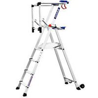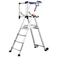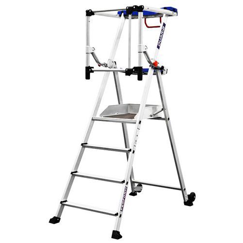 Piattaforma singola fissa autoportante nuova generazione in alluminio. Installazione rapida e facile con messa in sede dei parapetti con 1 solo gesto. Sicurezza elevata con protezione posteriore tramite parapetti articolati e aggancio automatico. Piattaforma comoda e pratica con 2 ripiani di serie a scomparti. Gradini con larghezza 80 mm per un accesso ultra comodo.