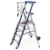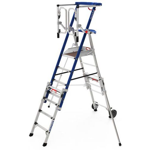 Piattaforma telescopica in alluminio che offre la possibilità di lavorare a diverse altezze. Spiegamento istantaneo. Accesso tramite gradini antiscivolo. Installazione del guardrail in un solo gesto. 2 ripiani standard con scomparti. Ripiano inferiore adatto per fusto da 15 litri. Dimensioni piegate ottimizzate. Facile da spostare in cantiere. Regolazione intuitiva dell'altezza: piani scorrevoli azionati manualmente (brevettati) con chiusura automatica. Stabilizzatori a regolazione millimetrica molto facili da implementare. Installazione in elevazioni. Carico max. (kg) : 150 kg Garanzia Cliente : 5 anni