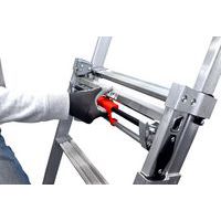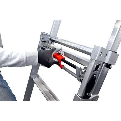 Piattaforma telescopica in alluminio che offre la possibilità di lavorare a diverse altezze. Spiegamento istantaneo. Accesso tramite gradini antiscivolo. Installazione del guardrail in un solo gesto. 2 ripiani standard con scomparti. Ripiano inferiore adatto per fusto da 15 litri. Dimensioni piegate ottimizzate. Facile da spostare in cantiere. Regolazione intuitiva dell'altezza: piani scorrevoli azionati manualmente (brevettati) con chiusura automatica. Stabilizzatori a regolazione millimetrica molto facili da implementare. Installazione in elevazioni.