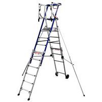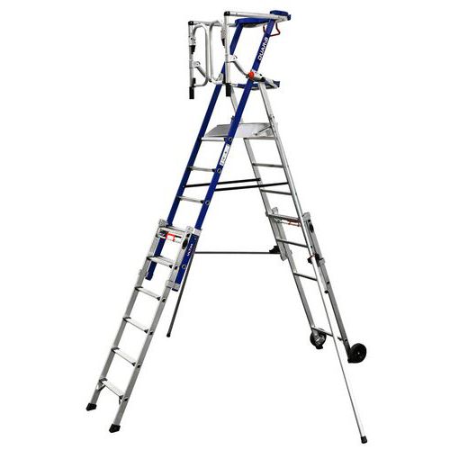 Piattaforma telescopica in alluminio che offre la possibilità di lavorare a diverse altezze. Spiegamento istantaneo. Accesso tramite gradini antiscivolo. Installazione del guardrail in un solo gesto. 2 ripiani standard con scomparti. Ripiano inferiore adatto per fusto da 15 litri. Dimensioni piegate ottimizzate. Facile da spostare in cantiere. Regolazione intuitiva dell'altezza: piani scorrevoli azionati manualmente (brevettati) con chiusura automatica. Stabilizzatori a regolazione millimetrica molto facili da implementare. Installazione in elevazioni. Carico max. (kg) : 150 kg Garanzia Cliente : 5 anni