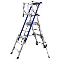 Piattaforma telescopica in alluminio che offre la possibilità di lavorare a diverse altezze. Spiegamento istantaneo. Accesso tramite gradini antiscivolo. Installazione del guardrail in un solo gesto. 2 ripiani standard con scomparti. Ripiano inferiore adatto per fusto da 15 litri. Dimensioni piegate ottimizzate. Facile da spostare in cantiere. Regolazione intuitiva dell'altezza: piani scorrevoli azionati manualmente (brevettati) con chiusura automatica. Stabilizzatori a regolazione millimetrica molto facili da implementare. Installazione in elevazioni. Garanzia Cliente : 5 anni Carico max. (kg) : 150 kg