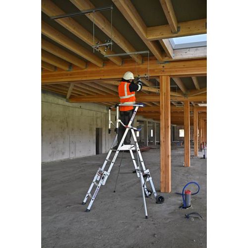 Piattaforma telescopica in alluminio che offre la possibilità di lavorare a diverse altezze. Spiegamento istantaneo. Accesso tramite gradini antiscivolo. Installazione del guardrail in un solo gesto. 2 ripiani standard con scomparti. Ripiano inferiore adatto per fusto da 15 litri. Dimensioni piegate ottimizzate. Facile da spostare in cantiere. Regolazione intuitiva dell'altezza: piani scorrevoli azionati manualmente (brevettati) con chiusura automatica. Stabilizzatori a regolazione millimetrica molto facili da implementare. Installazione in elevazioni.