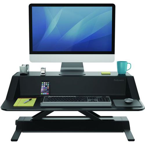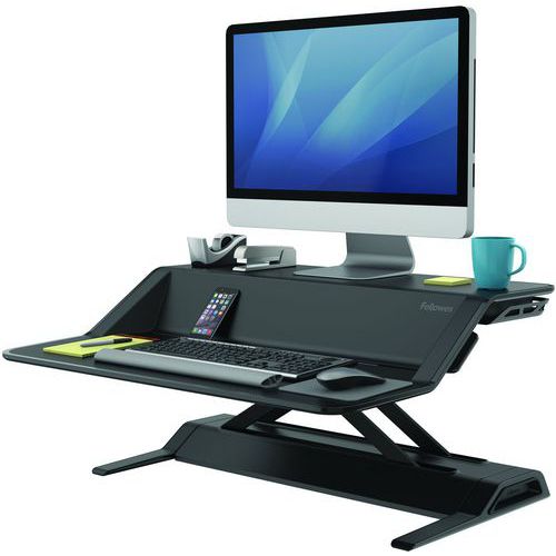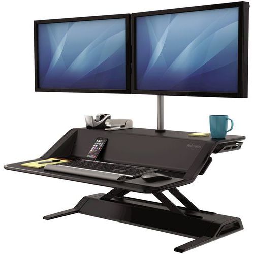 Piattaforma Sit Stand con due superfici di lavoro con spazi utili per tutti gli accessori da ufficio, 22 possibili regolazioni in altezza, eccellente stabilità e bloccaggio della piattaforma all'altezza desiderata. Passacavo integrato per un ingombro minimo. Completamente assemblato per un'installazione rapida e semplice.