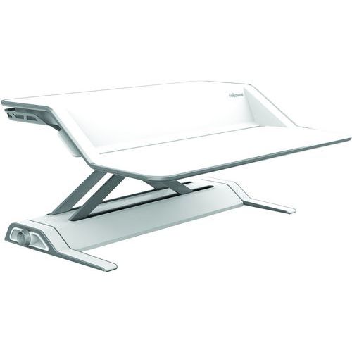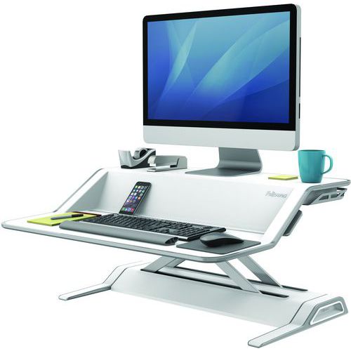 Piattaforma Sit Stand con due superfici di lavoro con spazi utili per tutti gli accessori da ufficio, 22 possibili regolazioni in altezza, eccellente stabilità e bloccaggio della piattaforma all'altezza desiderata. Passacavo integrato per un ingombro minimo. Completamente assemblato per un'installazione rapida e semplice.