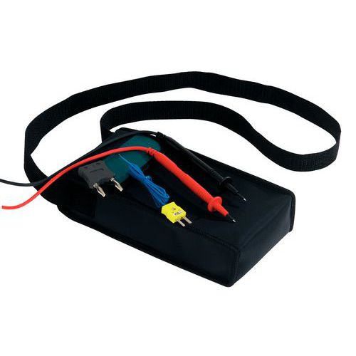 Venduto con un set di cavi di misurazione con punta di contatto, una termocoppia, una custodia per il trasporto e una guida all'uso.