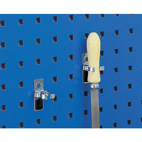 Per appendere i vostri attrezzi in tutta semplicità. Modello robusto di 6 mm di spessore. Fissate il supporto al pannello in un attimo grazie alle clip di sicurezza in plastica.