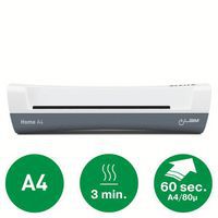 Plastificatrice iLam Home A4 Set 4-in-1 Leitz, preriscaldamento rapido in 3 minuti e velocità di 300 mm/min. Maggiore sicurezza grazie al sensore di surriscaldamento e allo spegnimento automatico. Kit completo con plastificatrice, tagliabordi, angoli arrotondati e buste. Facile da usare con spia led e leva di rilascio manuale.