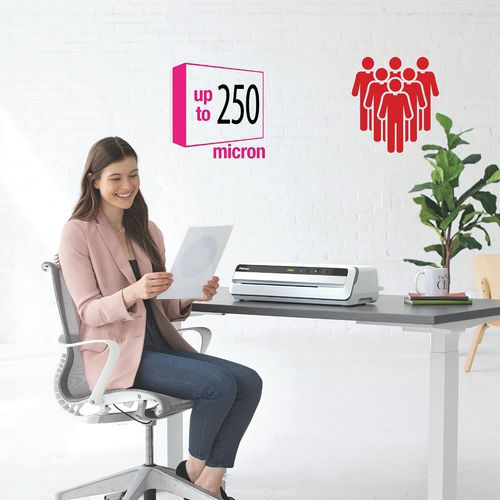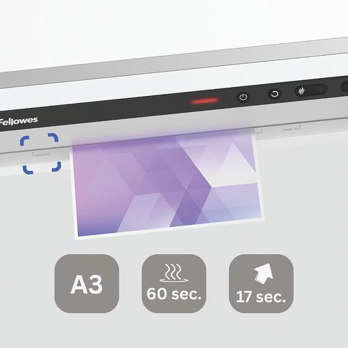 Pronta per la plastificazione in 60 secondi con tecnologia InstaHeat. Plastifica una busta A4 in 17 secondi (1400 mm/min). Dotata di 6 rulli per una qualità di plastificazione superiore. Accetta tutte le buste fino al formato A3 e fino a 250 micron. Sistema di monitoraggio avanzato delle buste con guida luminosa e inversione automatica per garantire la massima produttività e un funzionamento senza inceppamenti. Tecnologia AutoSense: rileva lo spessore della busta e regola automaticamente la plastificatrice all'impostazione migliore. Avviso di pulizia per risultati costanti di alta qualità e plastificazione ottimale. Stand-by automatico dopo 30 minuti d’inattività.