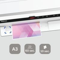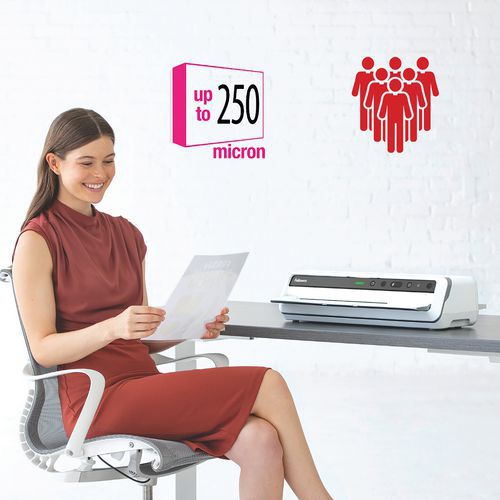 Ultra rapida. Plastifica una busta A4 in meno di 10 secondi (2180 mm/min). Pronta per la plastificazione in 30-60 secondi con tecnologia InstaHeat. Dotata di 6 rulli per una qualità di plastificazione superiore. Accetta tutte le buste fino al formato A3 e fino a 250 micron. Sistema di monitoraggio avanzato delle buste con guida luminosa e inversione automatica per prestazioni produttive e prive di inceppamenti. Tecnologia AutoSense: rileva lo spessore della busta e regola automaticamente la plastificatrice all'impostazione migliore. Stand-by automatico dopo 30 minuti d’inattività. Sistema di avviso di pulizia per risultati costanti di alta qualità e plastificazione ottimale.