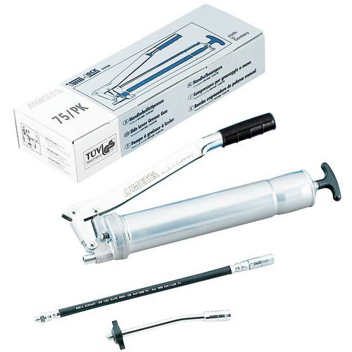 | Descrizione | Pompa di ingrassaggio a leva manuale, Volume: 500 cm³, Pressione max in uscita: 800 bar, Materiale: Acciaio |