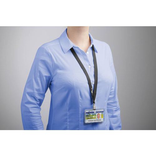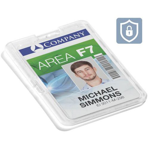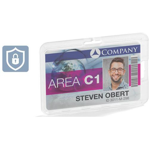 | Descrizione | Porta-badge permanente per 1 tessera di sicurezza, Altezza: 54 mm, Larghezza: 87 mm, Materiale: Policarbonato |