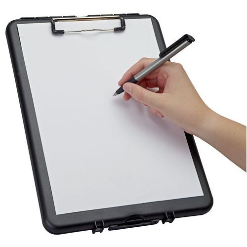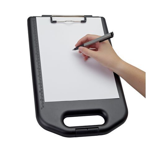 - Portablocco in plastica con ripiano di scrittura robusto e scomparto portaoggetti.