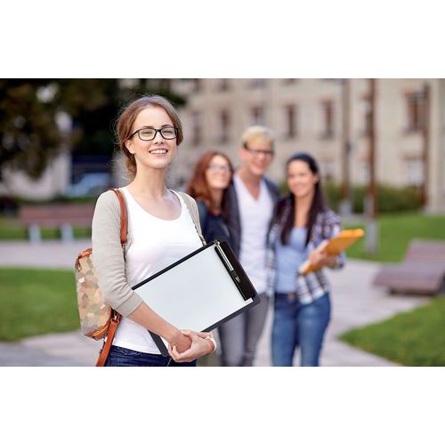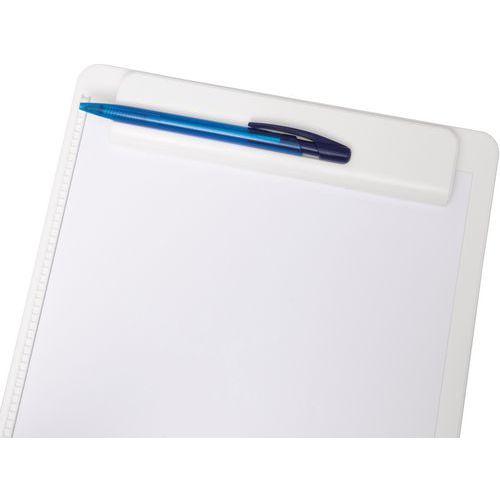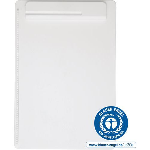 Portablocco A4 Go riciclaggio 90% plastica PS riciclata versione verticale: costituito da oltre l'85% di plastica riciclata (materiale post consumo). Confortevole: bordo sul lato sinistro, portapenna integrato nella pinza. Solido: ampia pinza in plastica con potenti molle metalliche. Apertura della pinza circa 0,8 cm.