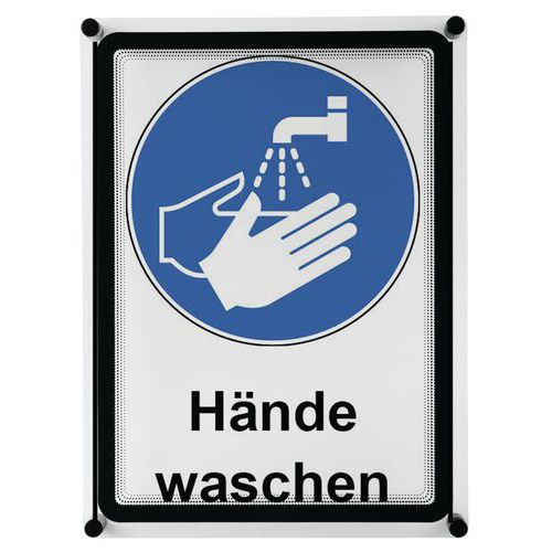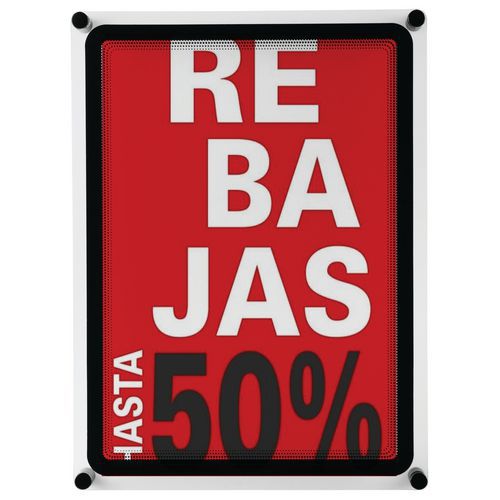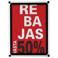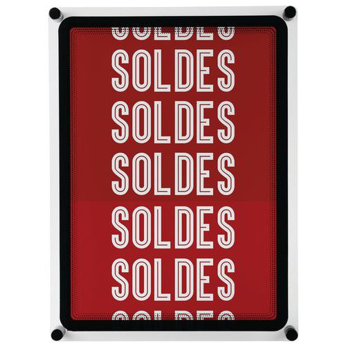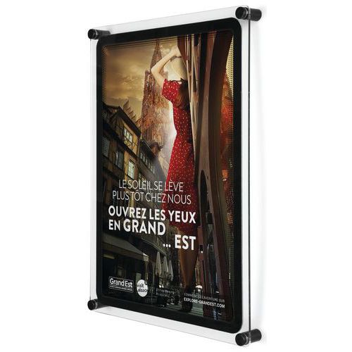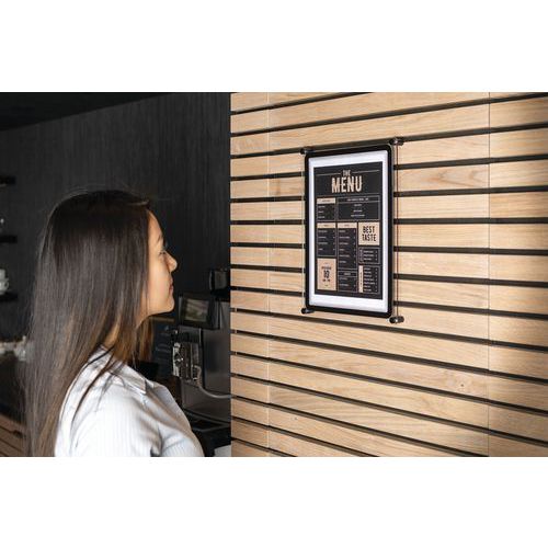 Con distanziatori che permettono di distanziare il portamanifesti dal muro, creando anche un look molto elegante e sofisticato.