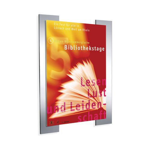 Il portamanifesti è dotato di una cornice design costituito da due pannelli in alluminio. Il vano in cui si inseriscono i manifesti è facilmente apribile e consente quindi una sostituzione rapida e facile del contenuto.