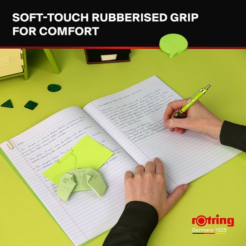 Portamine HB 0,7 mm Rotring Tikky Collection, leggero con impugnatura in gomma morbida al tatto per una scrittura estremamente confortevole. Ricaricabili e dotati di mine HB ad alto tenore di polimeri, meccanismo in ottone per un avanzamento preciso della mina. Il manicotto di guida fisso della mina previene la rottura e fornisce una visione chiara della pagina per un disegno preciso con il righello. Il corpo triangolare appositamente progettato non scivola su tavoli inclinati. Impugnatura in gomma morbida al tatto per il massimo comfort, con una gomma incorporata sotto il cappuccio del pulsante.