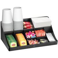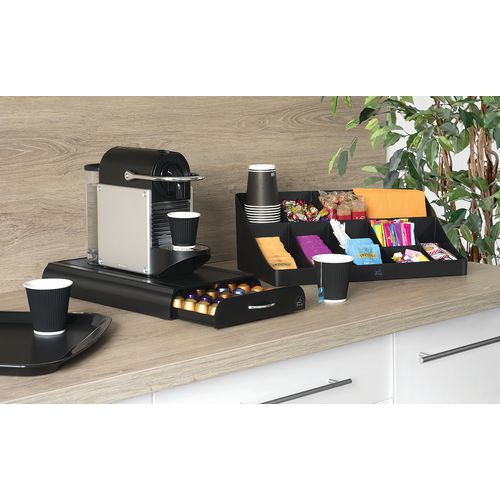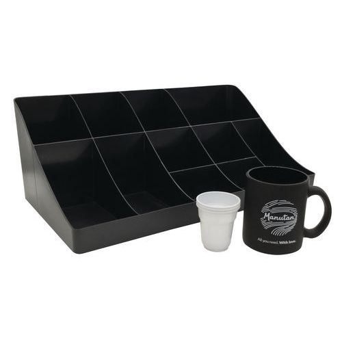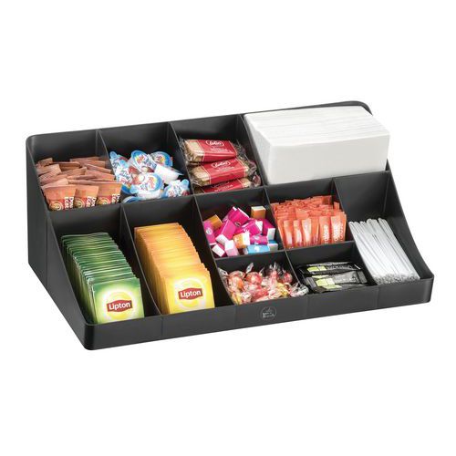 11 scomparti per riporre tutti gli accessori indispensabili accanto alla caffettiera e al bollitore (tovaglioli, bicchieri, cucchiai, zucchero, bustine di tè...)
