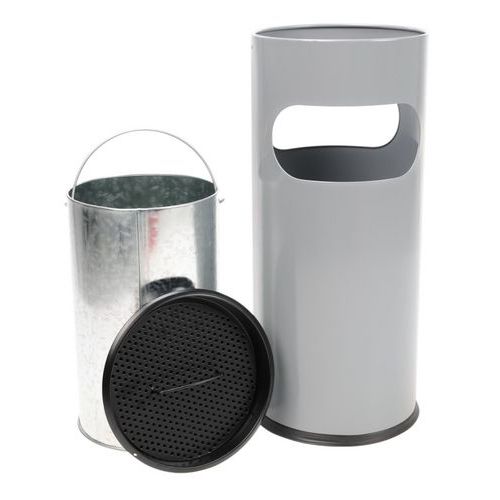 Posacenere-cestino ignifugo rotondo con contenitore interno in metallo. Dotato di un setaccio e di una piastra nera. Griglia per un facile spegnimento dei mozziconi di sigaretta. Maniglia sulla parte alta per agevolare lo svuotamento. Garanzia Cliente : 10 anni
