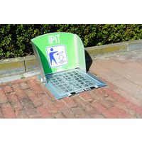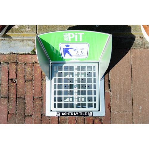 Piastrella posacenere realizzata in robusto acciaio zincato resistente alla corrosione provvista di griglia per una raccolta ottimale di rifiuti di piccole dimensioni e mozziconi di sigaretta.