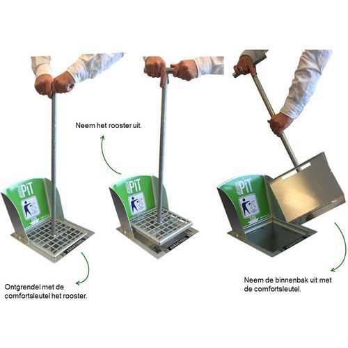 La piastrella posacenere è dotata di un esclusivo sistema di svuotamento: utilizzando la chiave comfort (da ordinare a parte) è possibile estrarre e svuotare la griglia e il contenitore interno in modo facile, rapido, igienico e responsabile.