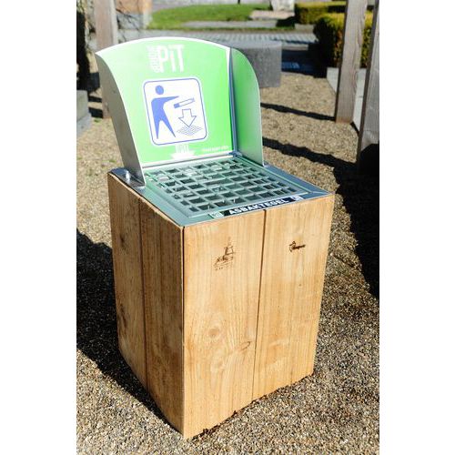 Dotato di un solido paravento e provvisto di vistoso adesivo antigraffio e resistente ai raggi UV con icona che raffigura un uomo che butta un oggetto nel cestino.