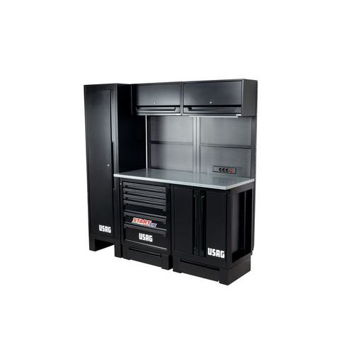 Postazione da officina composta da 1 pianale, da 1 mobile fisso con 6 cassetti, da 1 mobile fisso con 2 ante, 3 pannelli forati portautensili, 1 pannello forato portautensili con 3 prese SCHUKO e 2 porte USB, 2 pensili con anta basculante, 1 armadio a 1 anta, 3 rialzi per mobili, 2 lampade a LED e 2 cassetti su ruote per mobili base.
