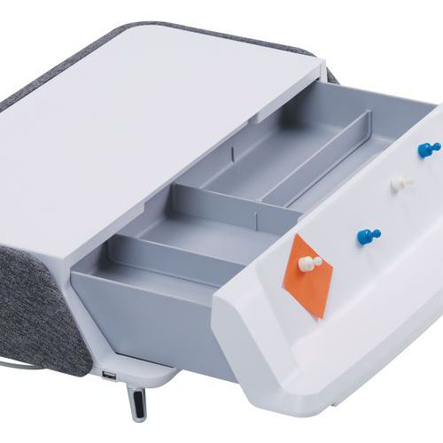 Postazione di lavoro ergonomica antibatterica con sterilizzazione a raggi UV. Lampada UV sotto al supporto: sterilizza ed elimina il 99% dei batteri presenti. Collegamento USB per caricare i telefoni cellulari e gli smartphone. Comoda e pratica con cassetto e accessori di contenimento e sistemazione. Supporto per schermo per garantire una perfetta posizione del corpo e il massimo benessere durante il lavoro. Carico max. (kg) : 10 kg Garanzia Cliente : 3 anni