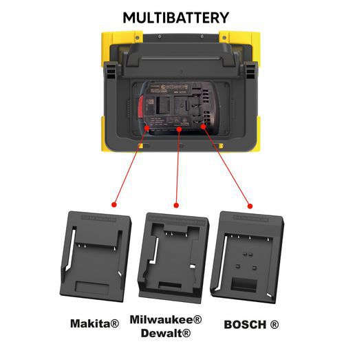 Ricaricabile, compatibile con diverse batterie 18V (fino a 12Ah) dei principali produttori di utensili elettrici: Bosch, Dewalt, Makita e Milwaukee.