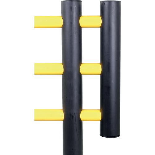 Barriera per scaffalature appositamente progettata per assorbire gli urti causati da collisioni con attrezzature di movimentazione. Materiale non corrosivo per uso esterno e interno. Per esterni e interni. Resistente ai raggi UV e agli agenti chimici high-ISO/TR 10358. Certificato TÜV.
