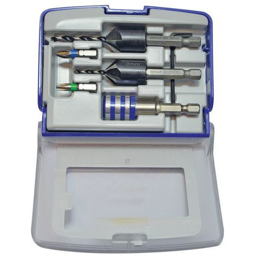 | Descrizione | Punte per legno-3 punte con fresa a 90° Quick Change-Tivoly, N. di pezzi: 5, Materiale: Acciaio |