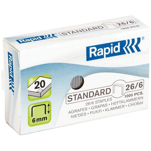 | Descrizione | Punti metallici standard 26/6 lotto da 1000, Tipo graffa: 26/6, N. di graffe/scatola: 1000 |