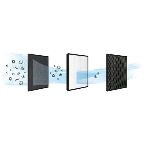 - Triplo filtraggio: prefiltro, Hepa e filtro a carboni attivi.