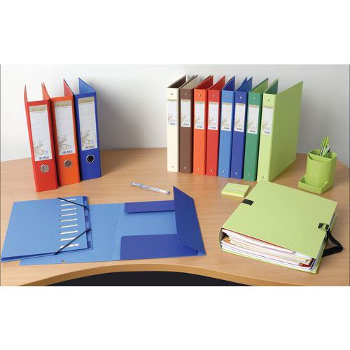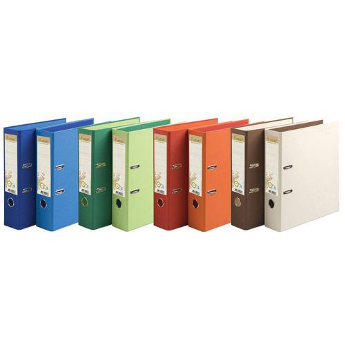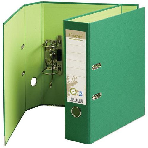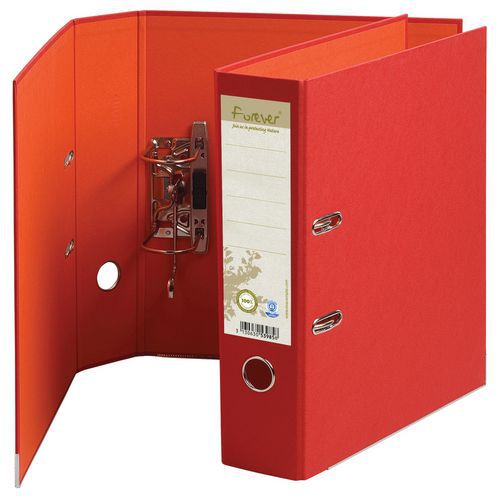 Raccoglitore a leva rinforzato retro 80mm Forever - A4 maxi. Raccoglitore a leva in materiale riciclato e certificato Ange Bleu. Colori fronte/retro vivaci adatti alla raccolta attuale. Dorso da 8 cm, etichetta sul dorso per una migliore identificazione del contenuto. Occhielli di presa e angoli metallici di rinforzo. Dotato di una meccanica Prem'Touch, robusta ed ergonomica grazie al pulsante. Garanzia di 10 anni