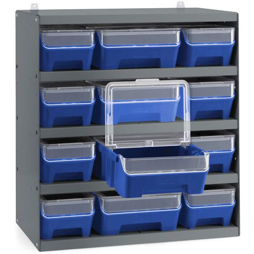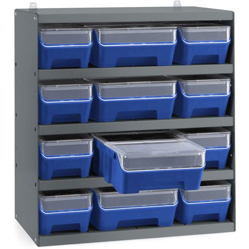 Fornito con 5 ripiani, ospita 12 scatole di viti e minuteria in due diverse larghezze, 141 e 214 mm, con un'altezza di 91 mm.