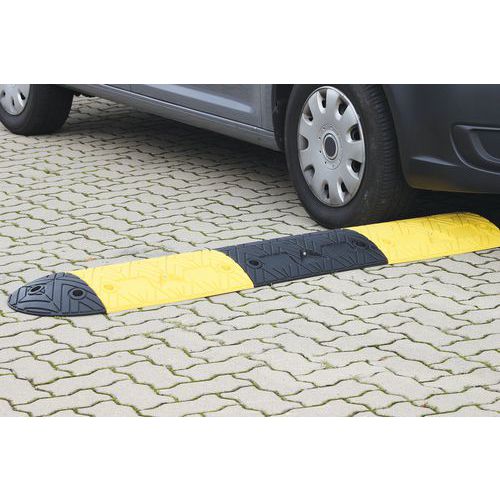 Rallentatore consigliato per una velocità massima a 20 km/h. Sistema modulare per comporre se stessi con una parte iniziale e finale e una o più parti centrali. Fabbricazione in gomma resistente alle temperature negative. Adatto per il passaggio di veicoli pesanti. Combinazione di colori giallo e nero.