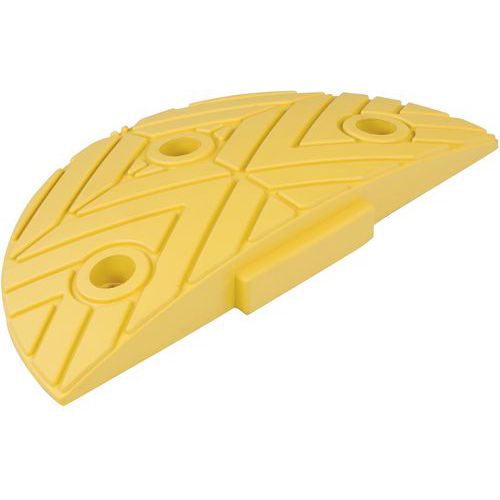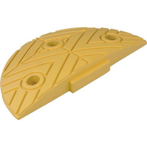 Rallentatore consigliato per una velocità massima a 20 km/h. Sistema modulare per comporre se stessi con una parte iniziale e finale e una o più parti centrali. Fabbricazione in gomma resistente alle temperature negative. Adatto per il passaggio di veicoli pesanti. Combinazione di colori giallo e nero.